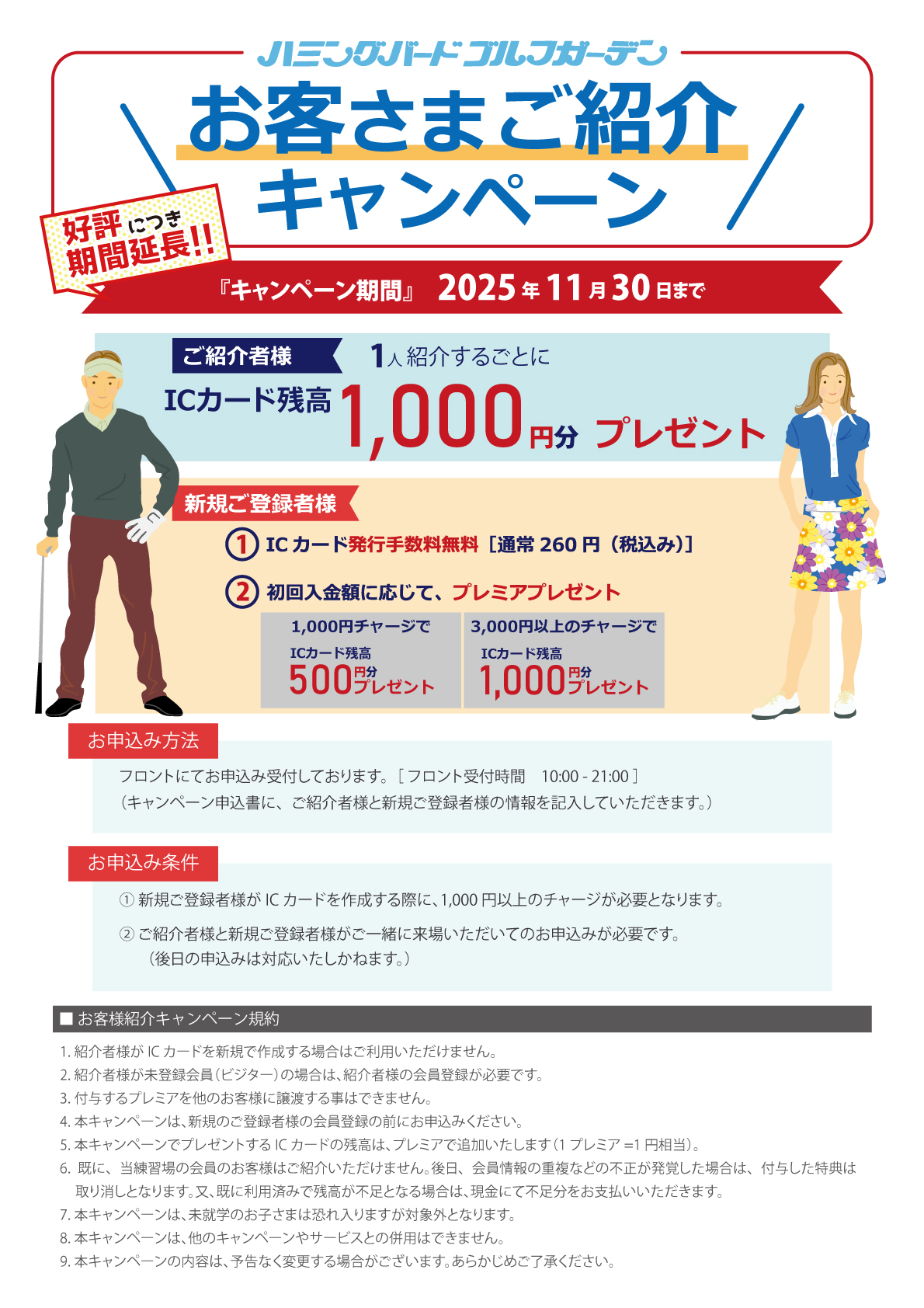 | ■ お客様紹介キャンペーン規約 | 1. 紹介者様がIC カードを新規で作成する場合はご利用いただけません。 2. 紹介者様が未登録会員(ビジター)の場合は、紹介者様の会員登録が必要です。 3. 付与するプレミアを他のお客様に譲渡する事はできません。 4. 本キャンペーンは、新規のご登録者様の会員登録の前にお申込みください。 5. 本キャンペーンでプレゼントするIC カードの残高は、プレミアで追加いたします(1 プレミア=1 円相当)。 6. 既に、当練習場の会員のお客様はご紹介いただけません。後日、会員情報の重複などの不正が発覚した場合は、付与した特典は 取り消しとなります。又、既に利用済みで残高が不足となる場合は、現金にて不足分をお支払いいただきます。 7. 本キャンペーンは、未就学のお子さまは恐れ入りますが対象外となります。 8. 本キャンペーンは、他のキャンペーンやサービスとの併用はできません。 9. 本キャンペーンの内容は、予告なく変更する場合がございます。あらかじめご了承ください。 |