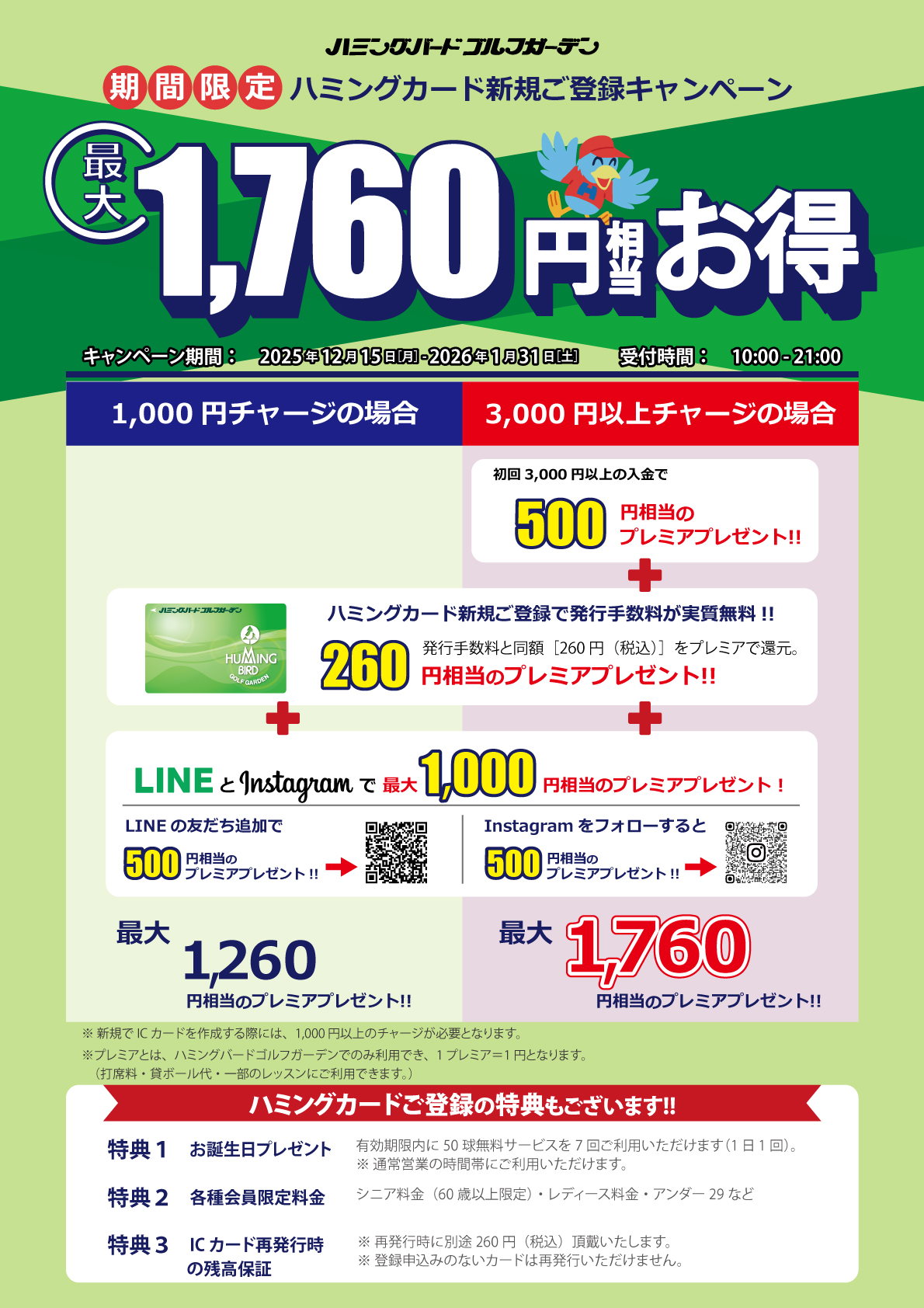 | キャンペーン特典 | 特典① 発行手数料260円(税込)相当のプレミアをプレゼント 特典② 3,000円以上の入金で500円相当のプレミアをプレゼント さらに! 公式LINE追加で500円プレミアプレゼント 公式インスタグラムをフォローで500円プレミアプレゼント最大1,760円お得になります!※プレミアとは、ハミングバードゴルフガーデンのみで利用できる もので、1プレミア=1円となります。 ※プレミアは練習と一部のレッスン(戸渡)でご利用いただけます。 |