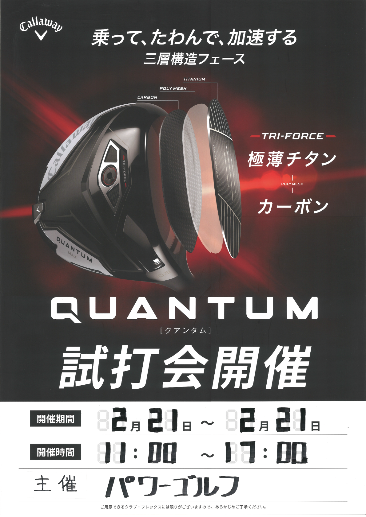 2026/01/25 新着情報 【2/21(土)開催】試打会のお知らせ「パワーゴルフ」 試打会のお知らせです。 日 時 2月21日(日) 11:00~17:00 会 場 ハミングバードゴルフガーデン1階 打席 主 催 パワーゴルフ 皆さまのご来場を心よりお待ち申し上げております。