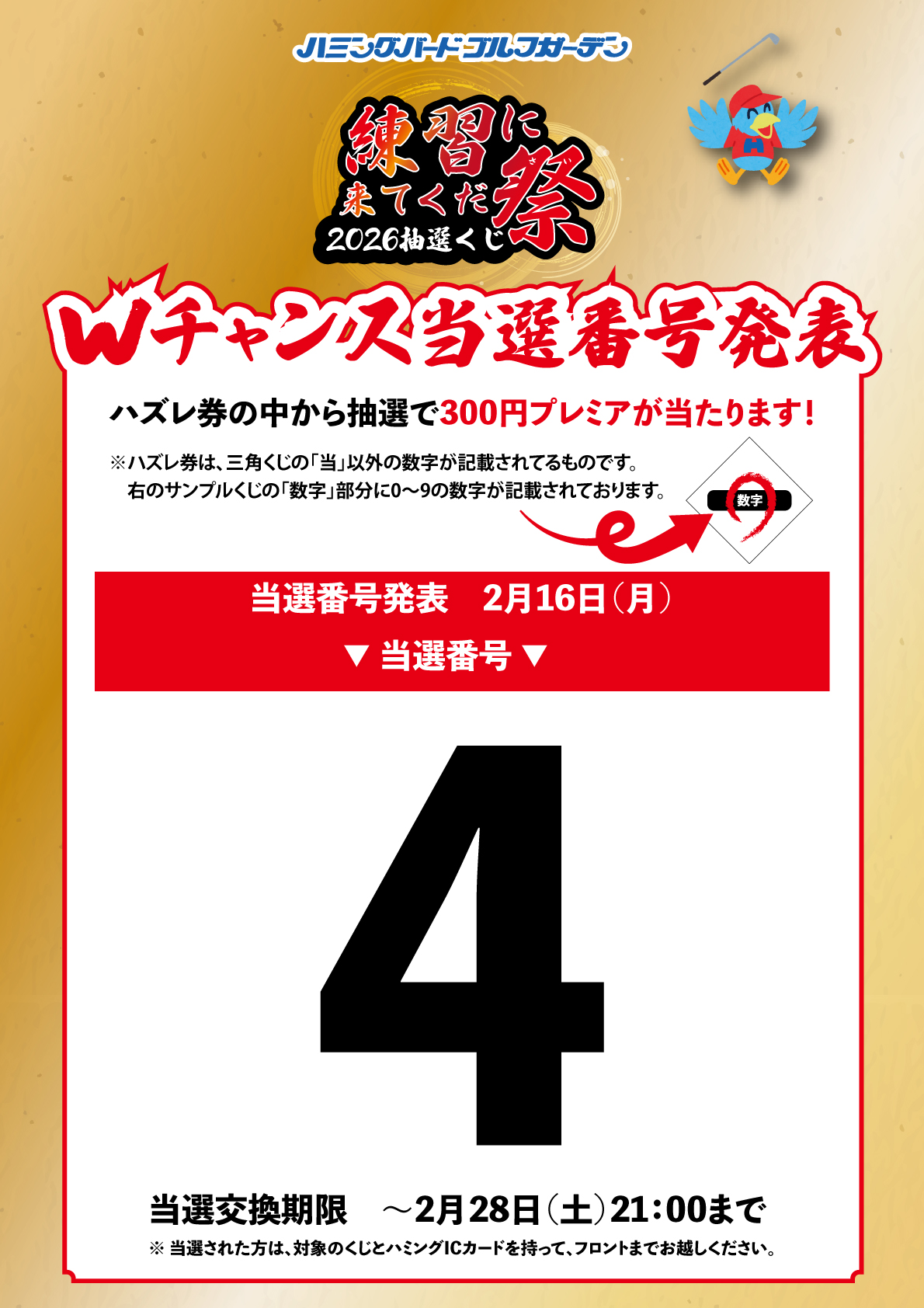2026/02/16 新着情報 【練習に来てくだ祭】Wチャンス当選番号発表! 【練習に来てくだ祭2026三角くじ】Wチャンスの当選番号発表!! 三角くじのハズレ券を持っている方は、お手持ちの番号をご確認ください! 当選者には、300円プレミアをプレゼントいたします。 当選された方は、当選くじとハミングICカードをお持ちくださいませ。 ※ハミングICカードへ300円分追加いたします。 引換えは、2026年2月28日(土)21:00までです。