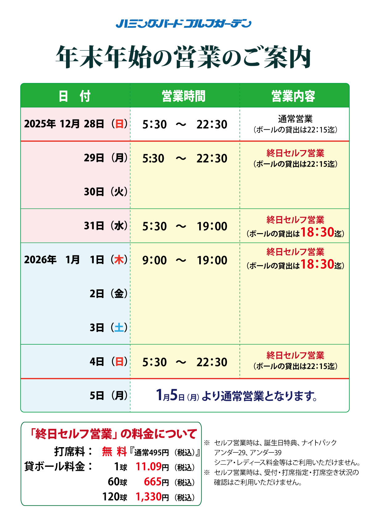 【2025/12/29(月)~2026/1/4(日)】年末年始の営業のご案内 2025/12/15 【2025年12月29日(月)~2026年1月4日(日)】の年末年始は、上記の内容で営業いたします。 ※2025年12月29日~2026年1月4日の期間中は、終日『早朝営業』と同じ料金・サービス内容で営業いたします。 他の料金・サービスはご利用いただけません。 『早朝営業』の料金内容はコチラ ※ 年末年始の期間中は、打席の指定はございません。終日セルフ営業です。